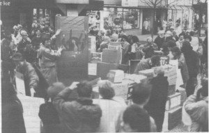 (ft) „Frauen untermauern ihre Forderungen“, war das Motto. des diesjährigen Frauentages am 8. März. Auf dem Leffers-Vorplatz wurde eine symbolische Mauer aus Pappkartons errichtet. Jeder Baustein dieser Mauer erhielt eine Forderung an die Männergesellschaft. Foto: Tunnat