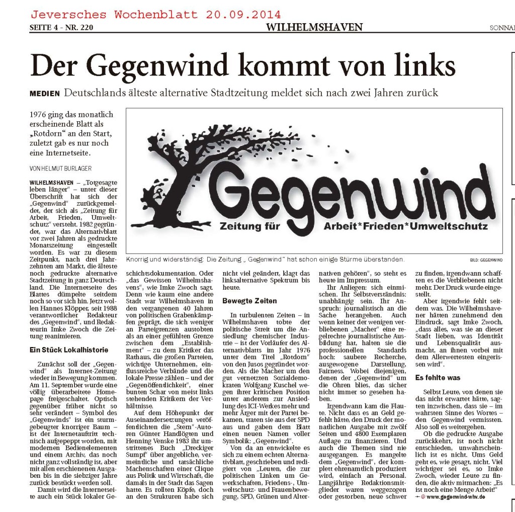 (hk) Eigentlich verlief der Neustart des Gegenwind recht unpopulär – keine Fete, keine Flyer – wir waren einfach wieder da (mit den erwarteten Startschwierigkeiten). Bemerkt wurde der Neustart des Gegenwind allerdings vom Jeverschen Wochenblatt, welches uns mit dem folgenden Artikel begrüßte: